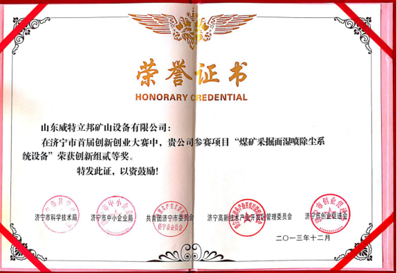 • 濟寧市首屆創新大賽“煤礦采掘面濕噴除塵系統設備”創新組二等獎